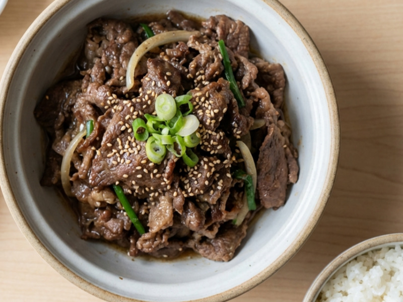 달콤 짭짤한 간장 소스에 얇은 소고기를 재워 볶은 요리. 매운 것을 못 먹는 외국인과 아이들에게 최고의 선택입니다.