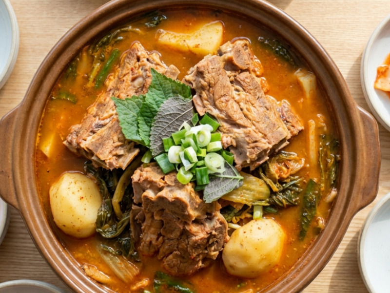 돼지 등뼈를 감자, 우거지와 함께 얼큰하게 끓여낸 탕. 뼈 사이의 살을 쏙쏙 발라 먹는 재미가 있습니다.