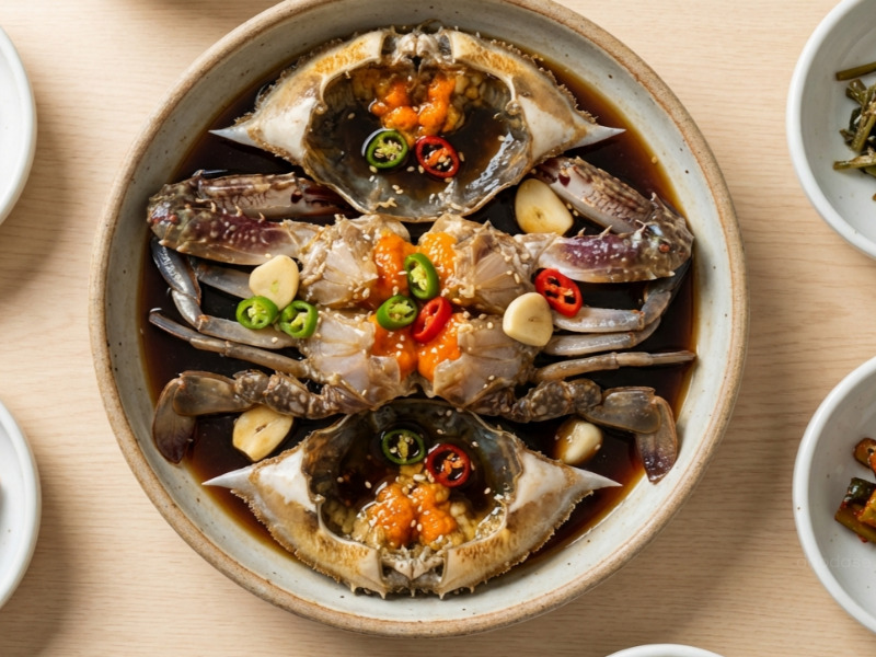 싱싱한 꽃게를 특제 간장 소스에 절인 요리. 짭조름하고 달콤한 맛이 밥을 끊임없이 부릅니다.