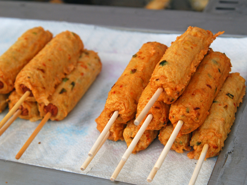 흰살 생선살을 으깨 야채, 소시지, 깻잎 등을 넣고 튀겨낸 어묵 바. 고속도로 휴게소에서 가장 인기 있는 간식입니다.