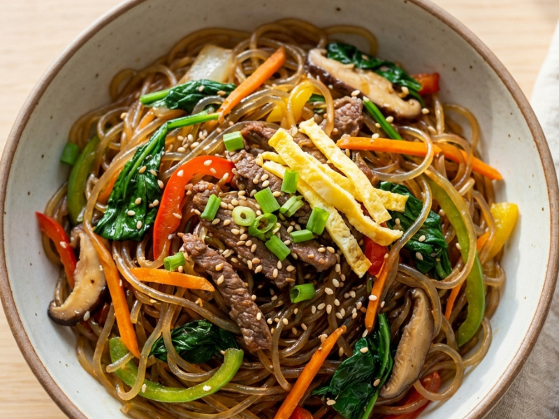 투명하고 탱글한 당면을 각종 야채, 고기와 함께 달콤한 간장에 볶은 요리. 생일이나 명절에 빠지지 않는 고급진 맛입니다.