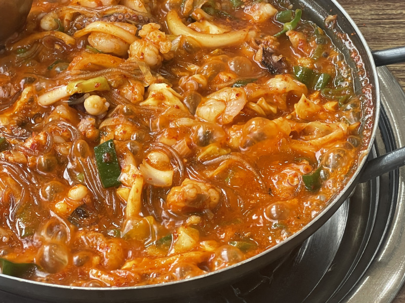 낙지(Nak), 곱창(Gop), 새우(Sae)를 매운 양념에 자박하게 끓인 부산의 명물 요리. 쫄깃, 고소, 탱글한 식감의 파티가 열립니다.