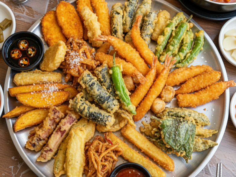 김말이, 오징어, 고구마, 만두 등 다양한 재료를 바삭하게 튀겨낸 모듬 세트. 떡볶이 국물에 찍어 먹어야 완성되는 맛입니다.