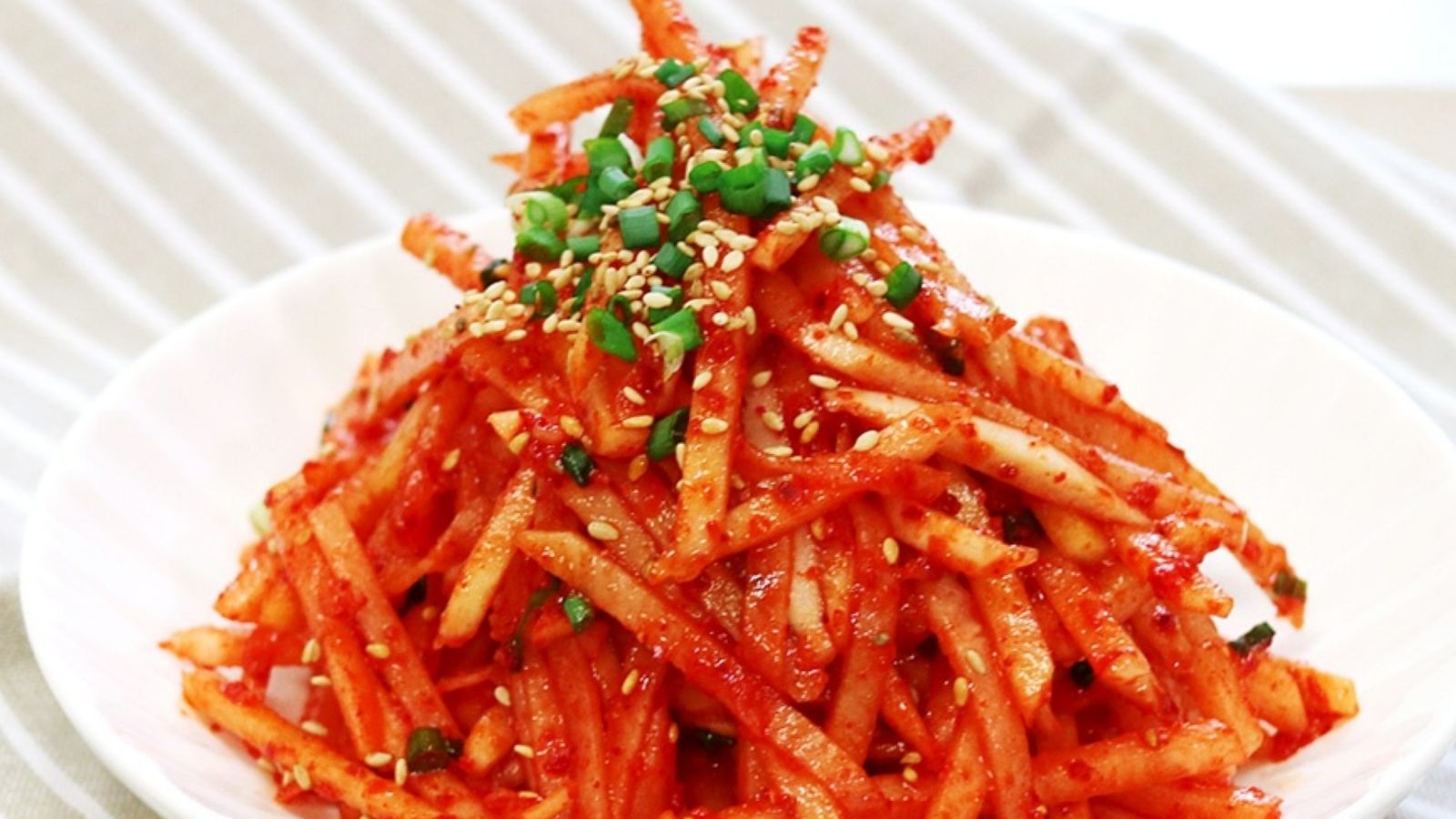 한국 속담에 '겨울 무는 인삼보다 낫다'는 말이 있습니다. 달고 수분이 많은 한국 무로 만든 무생채는 소화를 돕고 입맛을 돋워줍니다.